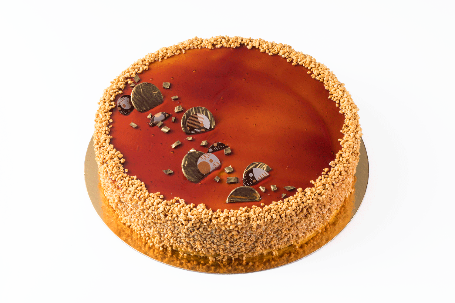 BUKOVSKÝ Traditional - Plát třený vanilkový, pralline vklad, karamelový krém, plát světlý piškot, krém z mascarpone, mirror karamel, dekorace.