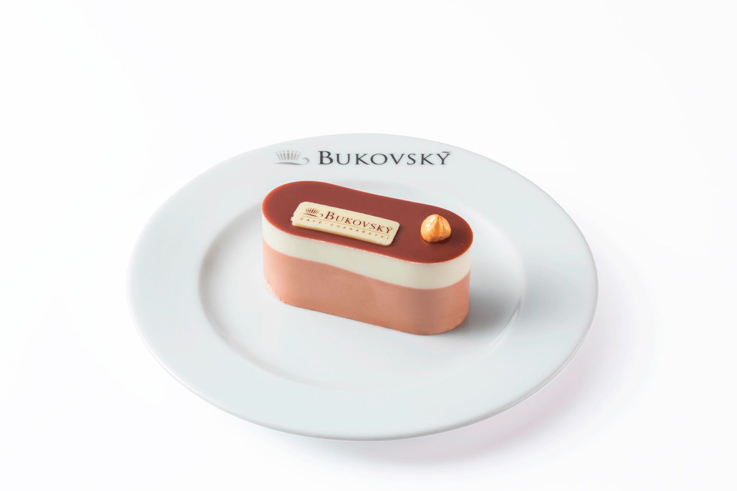 BUKOVSKÝ Evolution -mandlový plát, mousse z belgické mléčné čokolády Callebaut, pasta lískové ořechy IGT 100 %, mousse z belgické bílé čokolády Callebaut, čokoládová ganache, dekorace. Bez lepku.