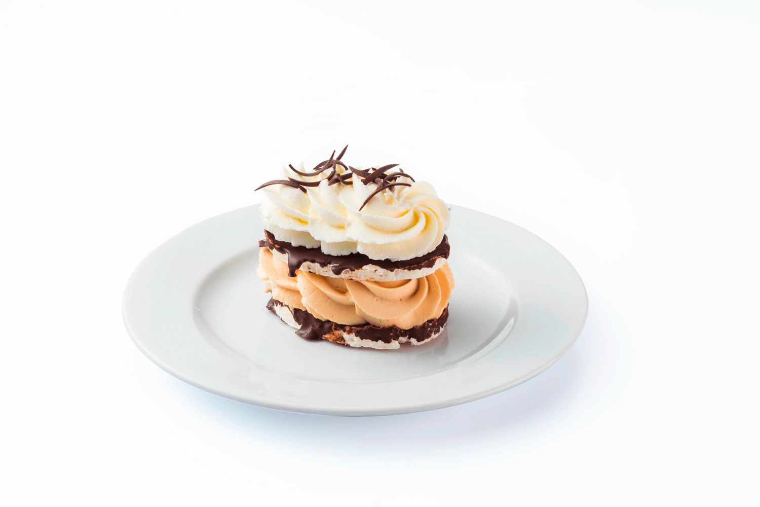 BUKOVSKÝ Traditional - Laskonky z kokos meringue potažené čokoládou, čerstvá šlehačka 33 %s karamelem, čerstvá šlehačka 33 % bílá, čokoládová dekorace. Bez lepku.