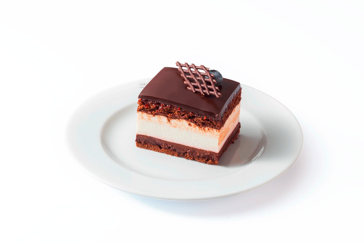 BUKOVSKÝ Traditional - plát třený kakaový, vklad ganache z hořké čokolády a pyré malina 100 %, krém tvarohový se šlehačkou, potaženo čokoládová ganache, dekorace.